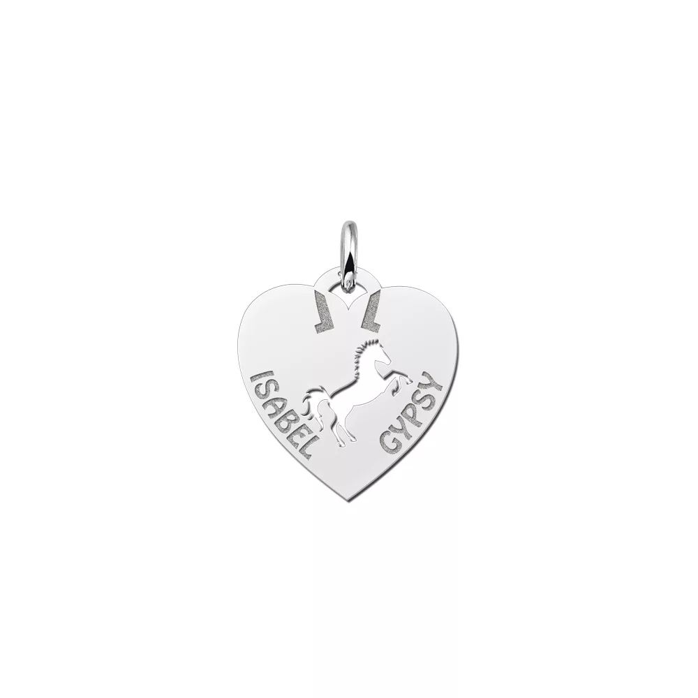 Paardengek of dol op je pony? Zilveren paardennaamhanger hart met een doorsnede van ca. 20mm. met paard. Leuk detail, het oogje van de naamhanger is een hoefijzertje! In de harthanger is er plaats voor 2 namen. Jouw naam en de naam van je paard of pony. Vergeet niet een bijpassende ketting mee te bestellen. Snelle en gratis levering!