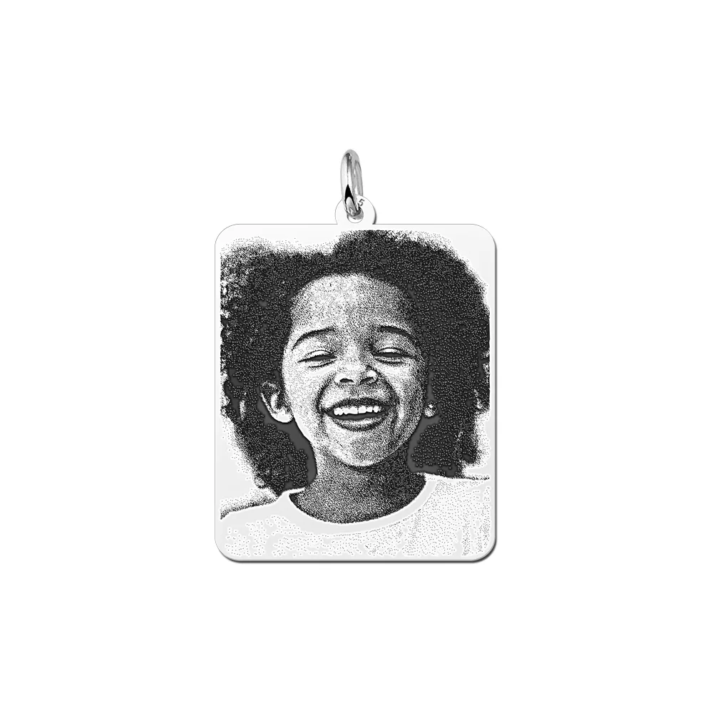 Deze zilveren foto hanger met rechthoekige vorm is gemaakt van hoogwaardig sterling zilver. Hij is 30 millimeter breed, 25 millimeter lang en 0,7 millimeter dik. In de foto hanger wordt de portretfoto die je wilt gegraveerd zodat je voor altijd een tastbare herinnering hebt aan het gezicht van een dierbare. De gravure wordt door met een speciale techniek donker gemaakt, waardoor de afbeelding altijd duidelijk en gedetailleerd te zien is.