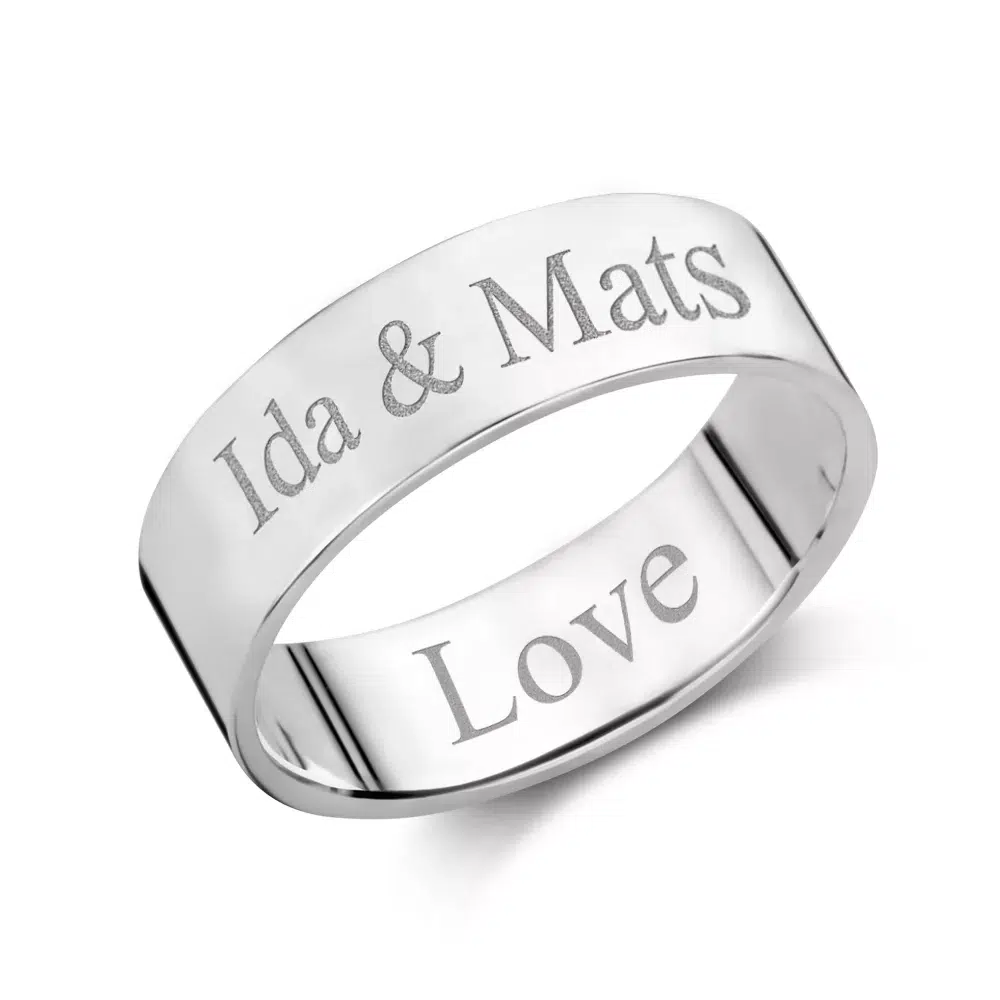Geefeenpersoonlijkcadeau maakt speciaal voor jou een prachtige zilveren ring met een gravering van een naam of een persoonlijke tekst. Op deze vlakke, zilveren ring met een breedte van 6mm wordt deze tekst heel duidelijk gegraveerd. Je kunt helemaal zelf kiezen of je een naam of een persoonlijke tekst op de ring wilt graveren. Daarnaast kun je zelf bepalen in welk lettertype je deze tekst wilt laten graveren. Kies één van de lettertypes die je vindt op het pdf-bestand. Deze vlakke ring is een absolute blikvanger, een lust voor het oog. Op deze zilveren ring kun je natuurlijk een van de voorbeeldteksten laten graveren, maar je kunt natuurlijk zelf een tekst schrijven. Of als je dat liever hebt, wordt gewoon de naam van en geliefde op zilveren ring gegraveerd. Deze vlakke ring met gegraveerde tekst zal veel bewonderende reacties uitlokken. Heb je de wereld iets bijzonders te vertellen? Of wil je een geliefde verrassen met een gepersonaliseerd cadeau voor een verjaardag of met kerst? Twijfel niet langer en bestel nog vandaag deze mooie ring! Je zult werkelijke versteld staan.