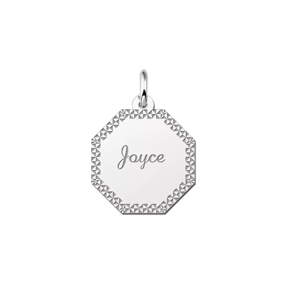 Wat een mooie zilveren graveerplaat voor je naam gravure met een schitterende sierrand is dit! Met een charmante acht kantige vorm heb jij een in het oog springende graveerplaat van zilver. Wat een schitterend idee om deze graveerplaat van zilver voor bijvoorbeeld je verjaardag te vragen, of misschien moet jij binnenkort wel examen doen. Dan is dit toch ook het perfecte cadeau om te vragen! Een super leuke graveerplaat als nagedachtenis aan deze speciale gebeurtenis! De doorsnede van deze graveerplaat met naam gravure en sierrand is 17 x 17 mm. Geef nu jouw naam door, bestel er een elegante ketting bij en jouw graveerplaat van zilver is gelijk klaar om te dragen!