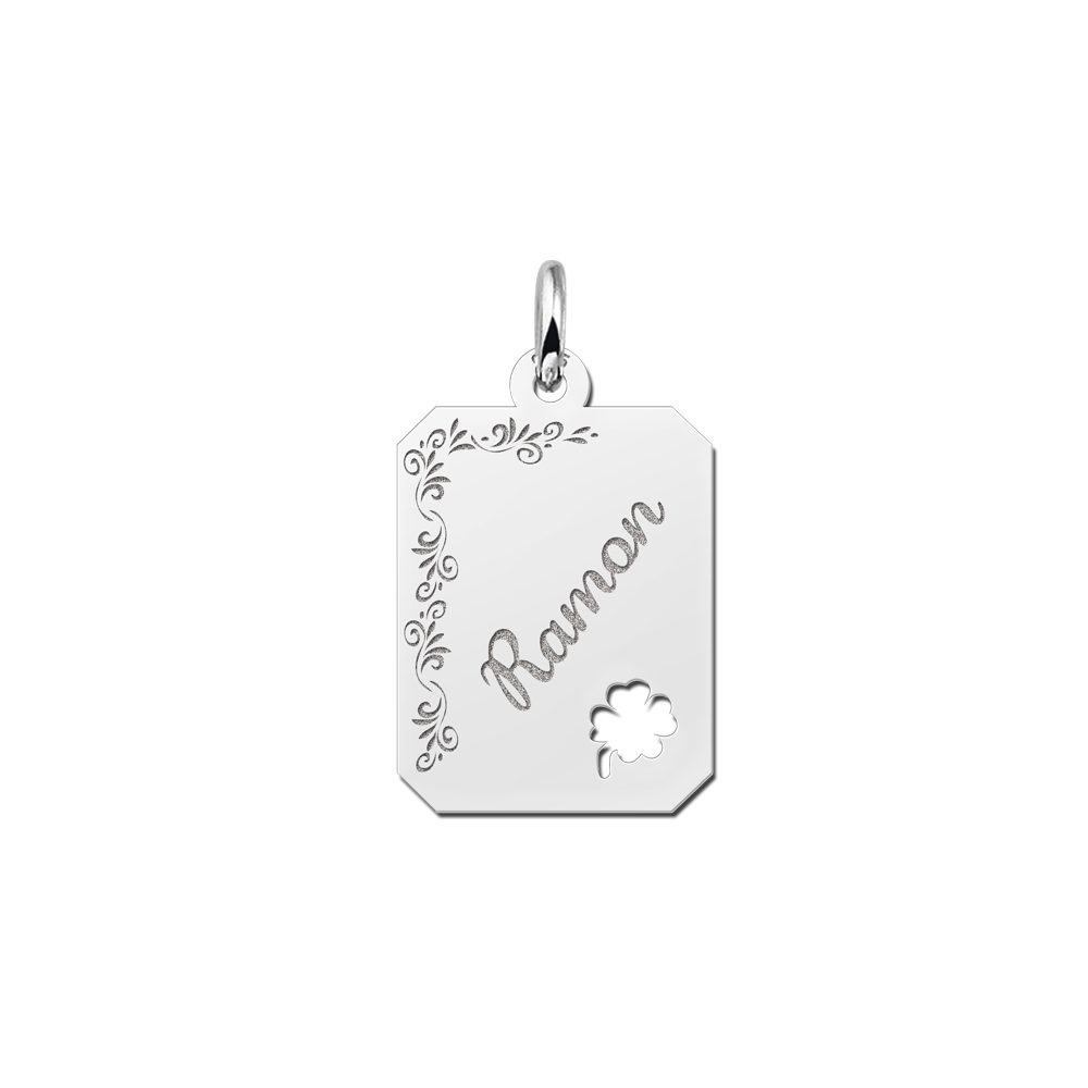Het zilveren graveerplaatje 8-kant is ca. 14 x 18 mm groot met een elegante bloem gravure. Het graveerplaatje wordt voorzien van een klaver4 en uiteraard de naam van jouw keuze. De naam wordt in sierlijke letters gegraveerd. Vergeet niet een bijpassende ketting mee te bestellen. Snelle en gratis levering!