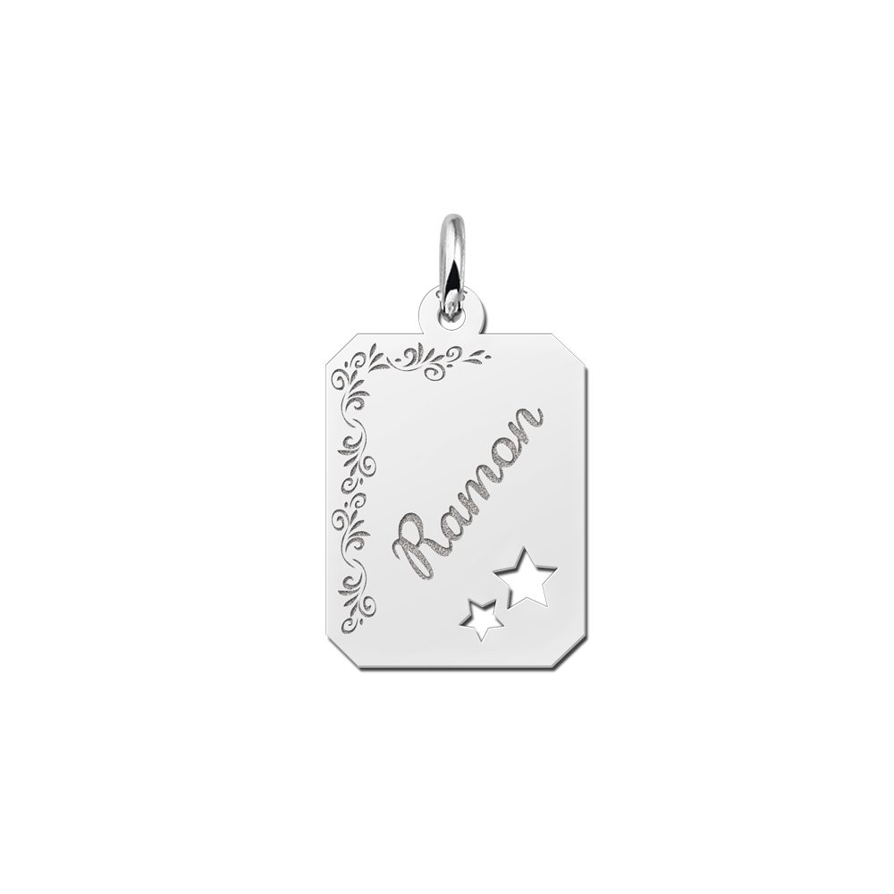 Het zilveren graveerplaatje 8-kant is ca. 14 x 18 mm groot met een elegante bloem gravure. Het graveerplaatje wordt voorzien van sterretje en uiteraard de naam van jouw keuze. De naam wordt in sierlijke letters gegraveerd. Vergeet niet een bijpassende ketting mee te bestellen. Snelle en gratis levering!