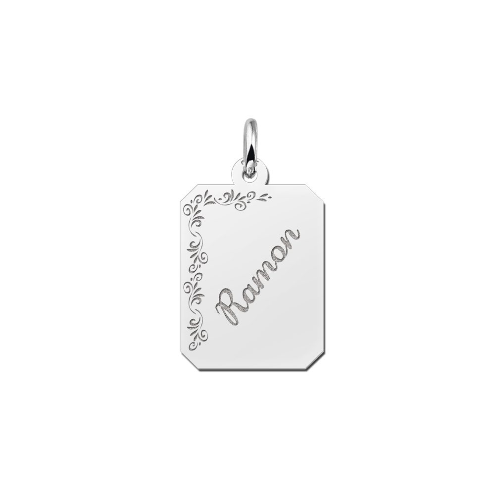 Zilveren dogtag rechthoek hanger bloemrand – 14 x 18 mm – Small