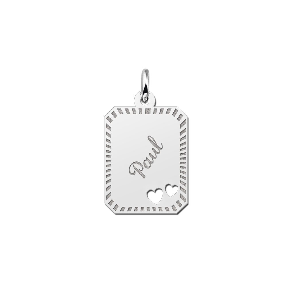 Het zilveren graveerplaatje 8-kant is ca. 14 x 18 mm groot en is omlijst met een sierlijke rand. Het graveerplaatje wordt uiteraard voorzien van de naam van jouw keuze en 2 hartjes. De naam wordt in sierlijke letters gegraveerd. Vergeet niet een bijpassende ketting mee te bestellen. Snelle en gratis levering!