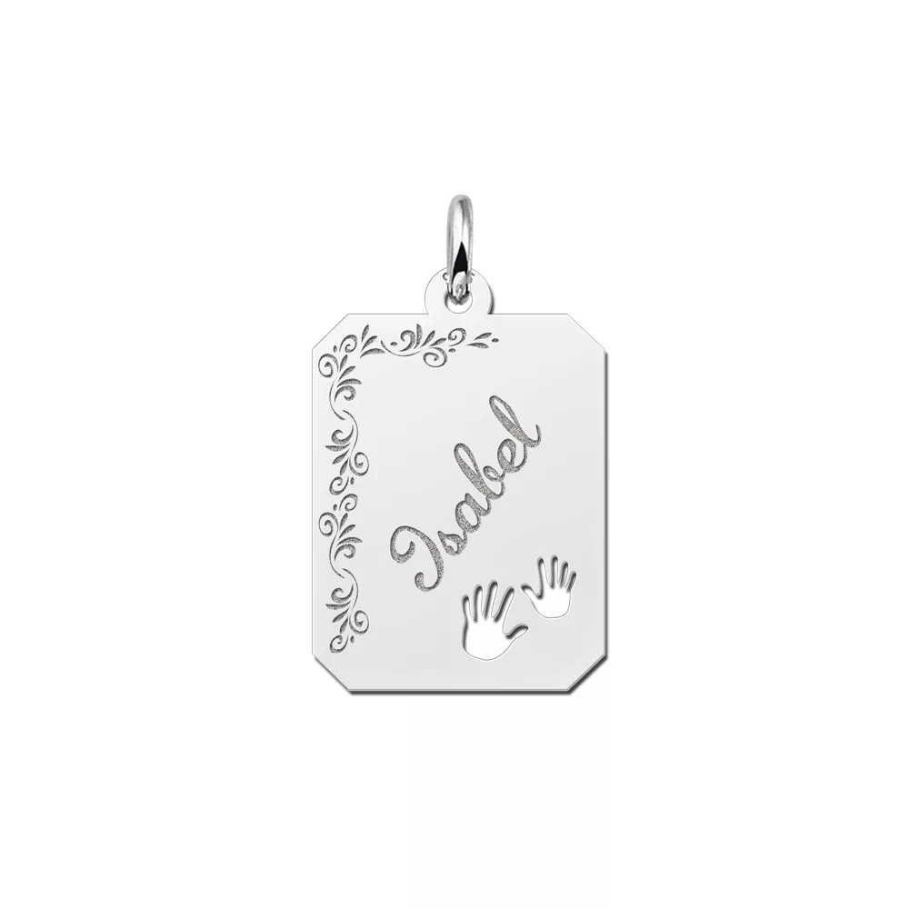 Het zilveren graveerplaatje 8-kant is ca. 16 x 20 mm groot met een elegante bloem gravure. Het graveerplaatje wordt voorzien van handjes en uiteraard de naam van jouw keuze. De naam wordt in sierlijke letters gegraveerd. Vergeet niet een bijpassende ketting mee te bestellen. Snelle en gratis levering!