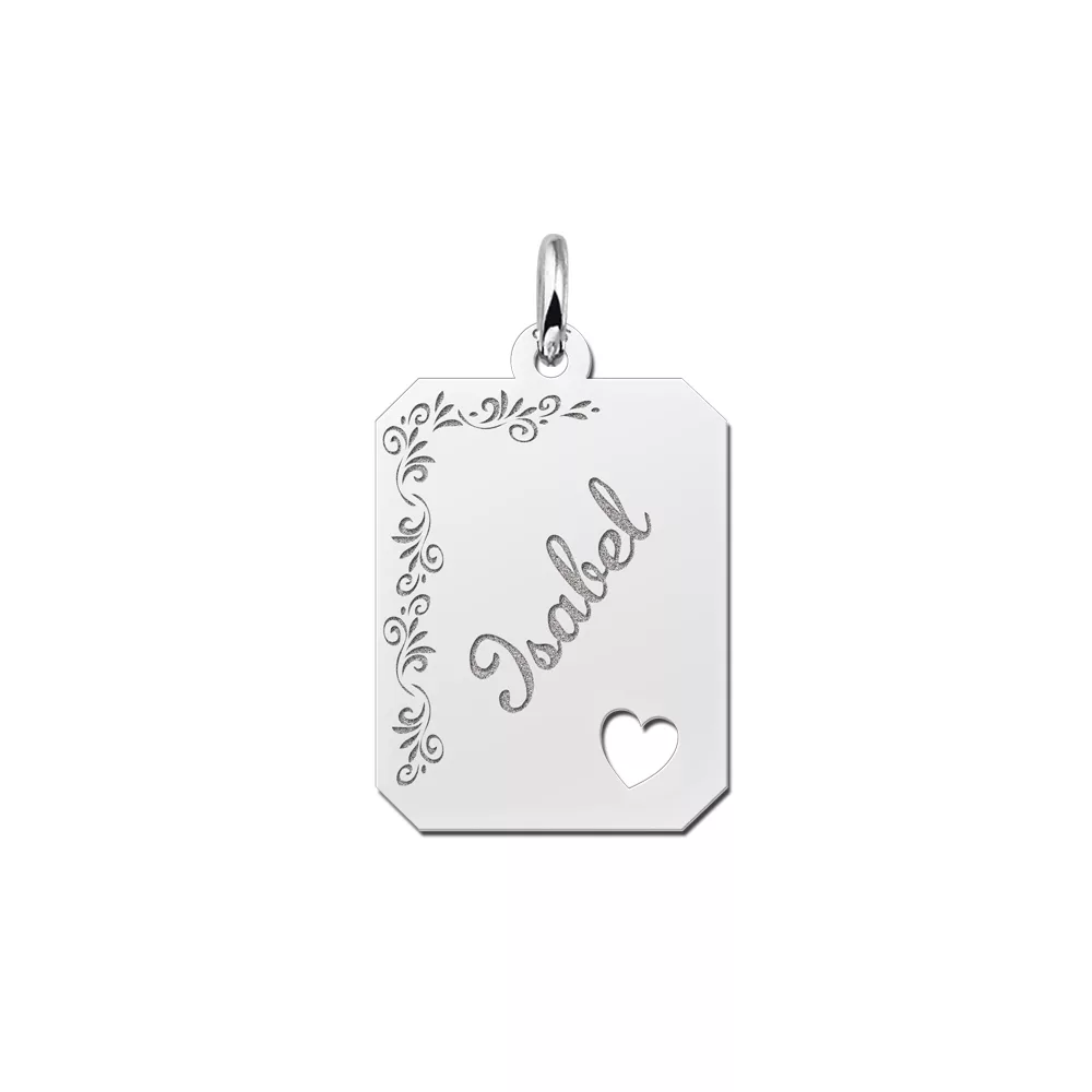 Het zilveren graveerplaatje 8-kant is ca. 16 x 20 mm groot met een elegante bloem gravure. Het graveerplaatje wordt voorzien van een hartje en uiteraard de naam van jouw keuze. De naam wordt in sierlijke letters gegraveerd. Vergeet niet een bijpassende ketting mee te bestellen. Snelle en gratis levering!