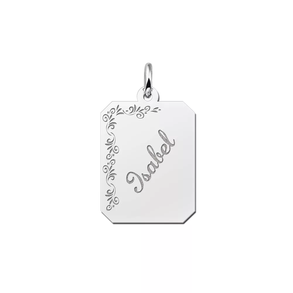 Het zilveren graveerplaatje 8-kant is ca. 16 x 20 mm groot met een elegante bloem gravure. Het graveerplaatje wordt voorzien van een hartje en uiteraard de naam van jouw keuze. De naam wordt in sierlijke letters gegraveerd. Vergeet niet een bijpassende ketting mee te bestellen. Snelle en gratis levering!