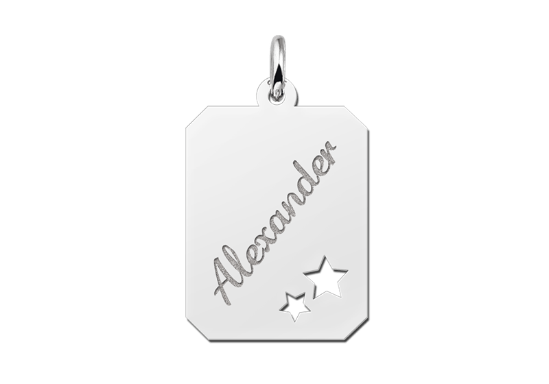 Het zilveren graveerplaatje 8-kant is ca. 16 x 20 mm groot en is voorzien van 2 sterretjes. In het plaatje wordt de naam van je keuze in sierlijke letters gegraveerd. Vergeet niet een bijpassende ketting mee te bestellen. Snelle en gratis levering!