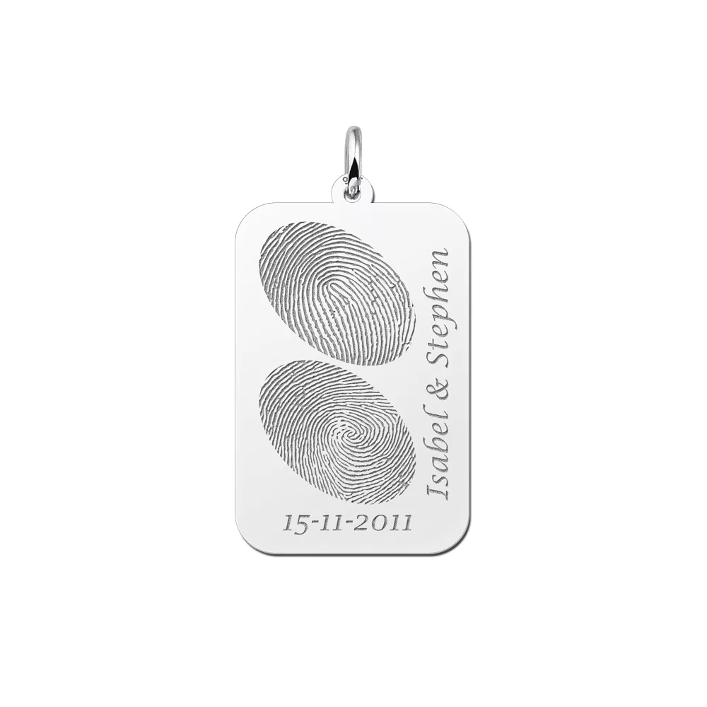 Zilveren hanger dogtag twee vingerafdrukken vervaardigt van 925 sterling zilver. Een prachtige hanger waarin wij niet één maar twee vingerafdrukken graveren! Deze zilveren hanger dogtag is een prachtig relatie sieraad. Naast de vingerafdrukken is er ook nog ruimte voor jullie namen en jullie datum. De zilveren dogtag hanger met twee vingerafdrukken heeft een formaat van ca. 20 x 30 mm. Een zeer persoonlijk vingerafdruk sieraad van zilver waarmee je je partner zeker zult verrassen! Bijpassende zilveren colliers zijn los verkrijgbaar.