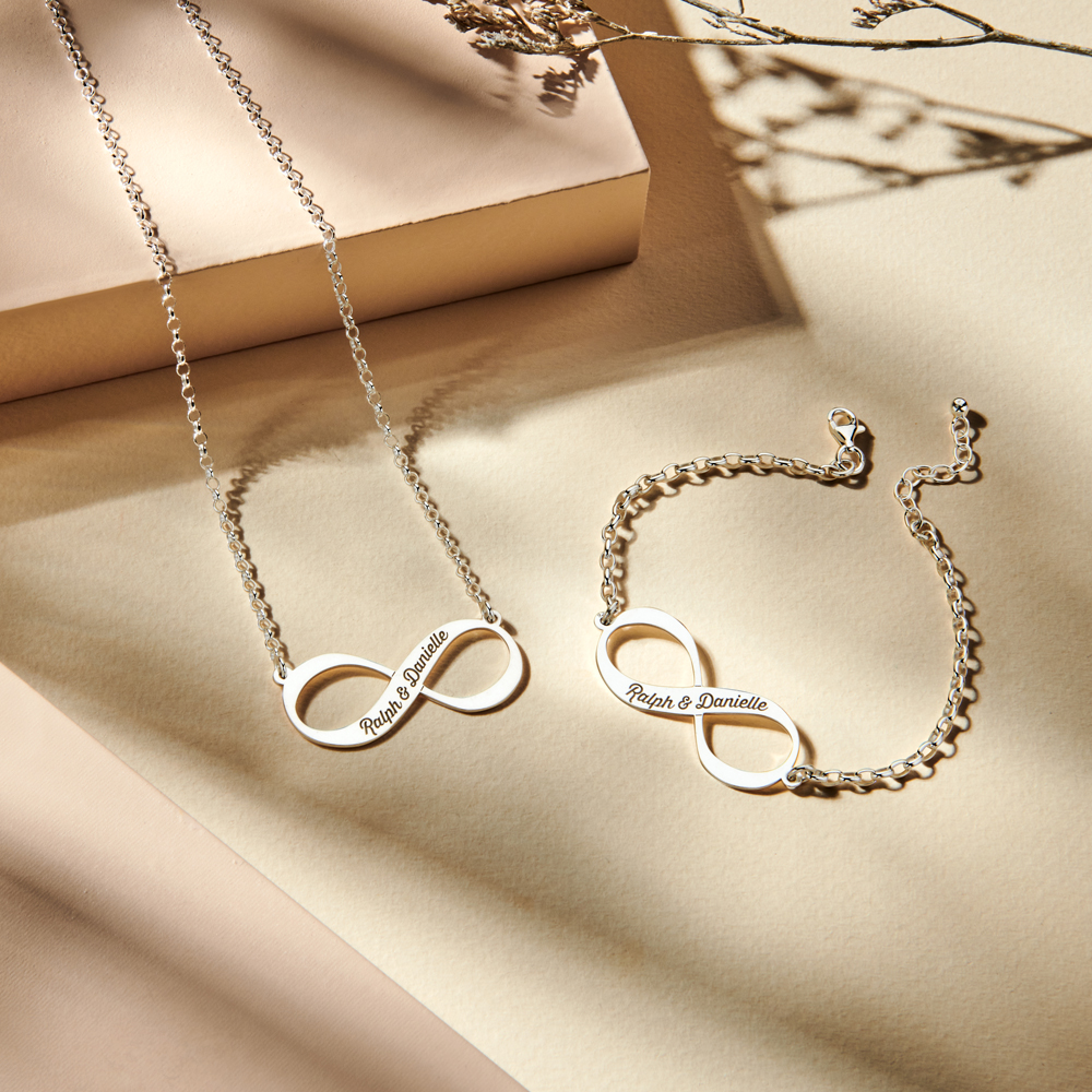 Op zoek naar een 925 Sterling zilveren infinity ketting en armband als set die je kunt personaliseren met jouw eigen gravure? Het plaatje van de ketting en de armband is 35 mm x 15 mm groot en heeft een dikte van 0,7 mm. De ketting wordt geleverd met een jasseron ketting 42 cm. Voor de armband hebben wij de maat 17 – 20 cm beschikbaar. Bovendien ontvang je het infinity set in een mooi sieradendoosje.