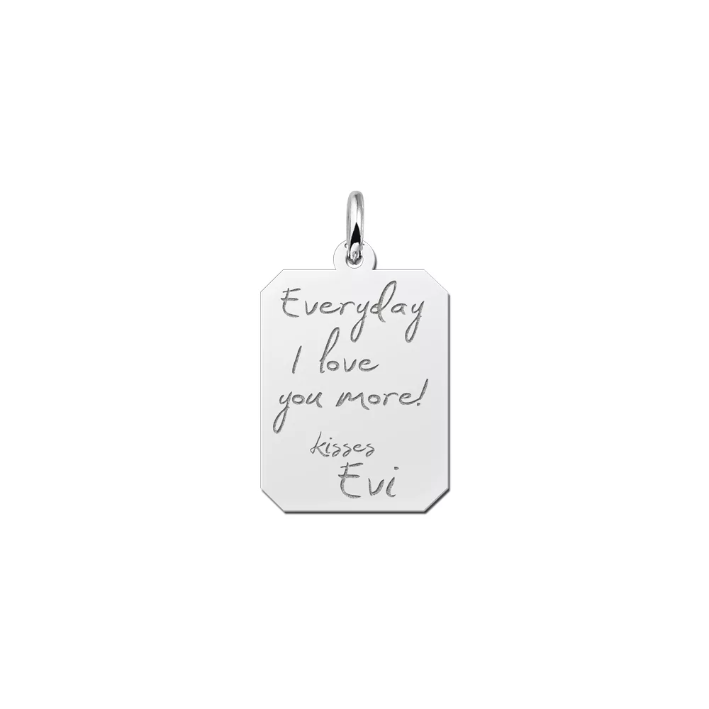 De zilveren hanger gegraveerd met text ziet er stoer uit, maar kan een lieve boodschap bevatten. De hanger heeft een afmeting van 16mm bij 23mm. Om jouw tekst op de hanger te kunnen graveren moeten je eerst het PDF bestand voor tekst gravering uitprinten. Schrijf vervolgens op dit papier de tekst van jouw keuze en upload een foto hiervan. Op deze manier kunnen we vervolgens de tekst op de zilveren hanger graveren. Bestel er direct een ketting bij wanneer je de zilveren hanger gegraveerd met tekst direct wil dragen nadat je hem ontvangt.