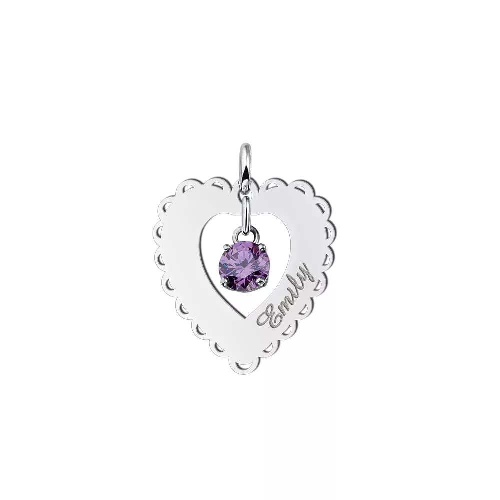 Schitterende zilveren hanger in de vorm van een liefdevol hart met sierlijk opengewerkte rand voorzien van jouw, haar of zijn naam. De naam wordt gegraveerd in sierlijke letters.