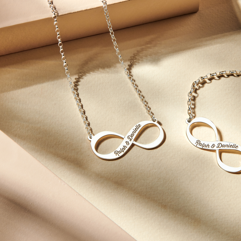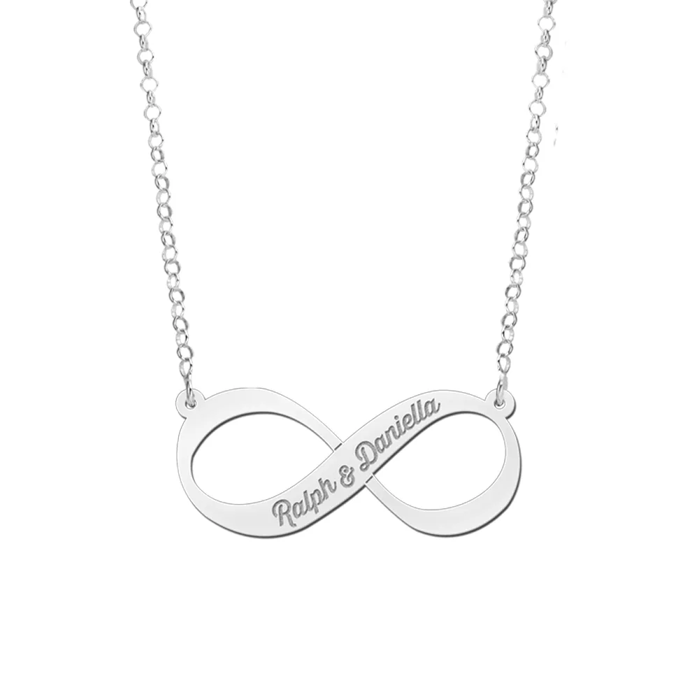 Op zoek naar een 925 Sterling zilveren infinity ketting die je kunt personaliseren met jouw eigen gravure? Bekijk dan eens deze infinity ketting. Het plaatje is 35 mm x 15 mm groot en heeft een dikte van 0,7 mm. Je kunt uit diverse kettinglengtes en types kettingen kiezen. Bovendien ontvang je het infinity sieraad in een mooi sieradendoosje.