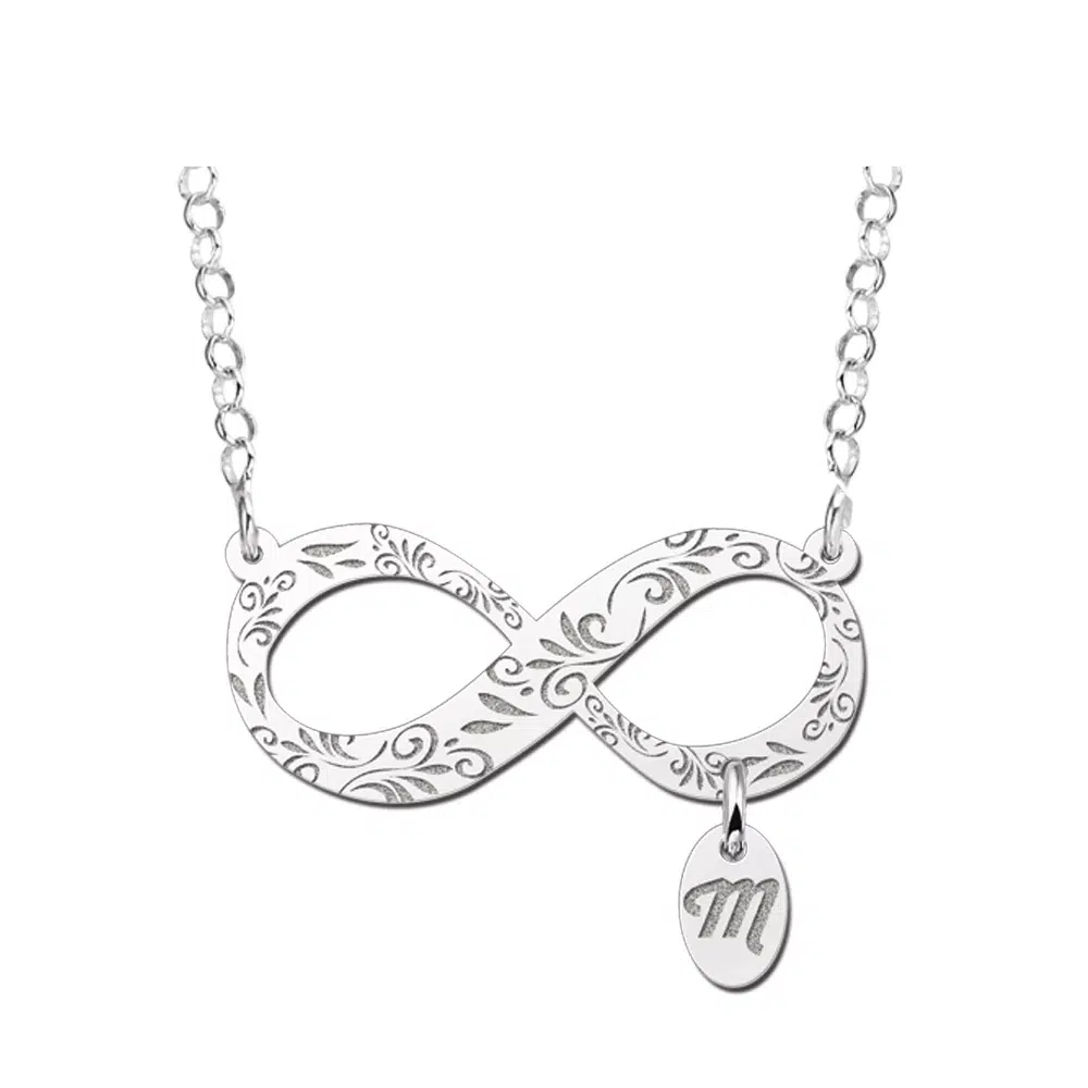 De zilveren hanger infinity sierrand met letterhanger ca. 35mm x 15mm en wordt voorzien van een ovaal hangertje met daarin een gravure van de door jouw opgegeven letter.