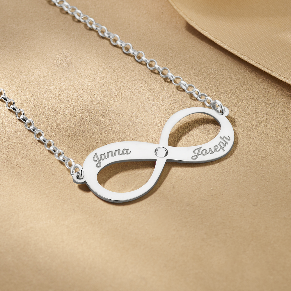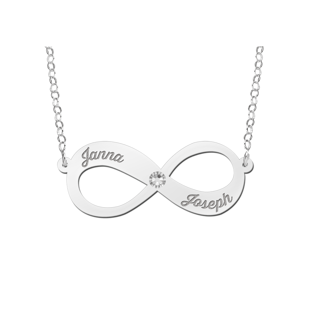 De zilveren hanger infinity met twee namen en een zirkonia is ca. 35mm x 15mm en wordt voorzien van de door jouw opgegeven namen. Het infinity symbool heeft wereldwijd de betekenis van oneindigheid. Dit geldt voor liefde, vriendschap,gezondheid, leven etc.Daarnaast staat het infinity symbool voor constante vernieuwing, harmonie, evenwicht en verbondenheid. Deze zilveren hanger wordt inclusief een fraaie zilveren jasseron ketting met een lengte van 42 cm geleverd. Wij garanderen een snelle en gratis levering.