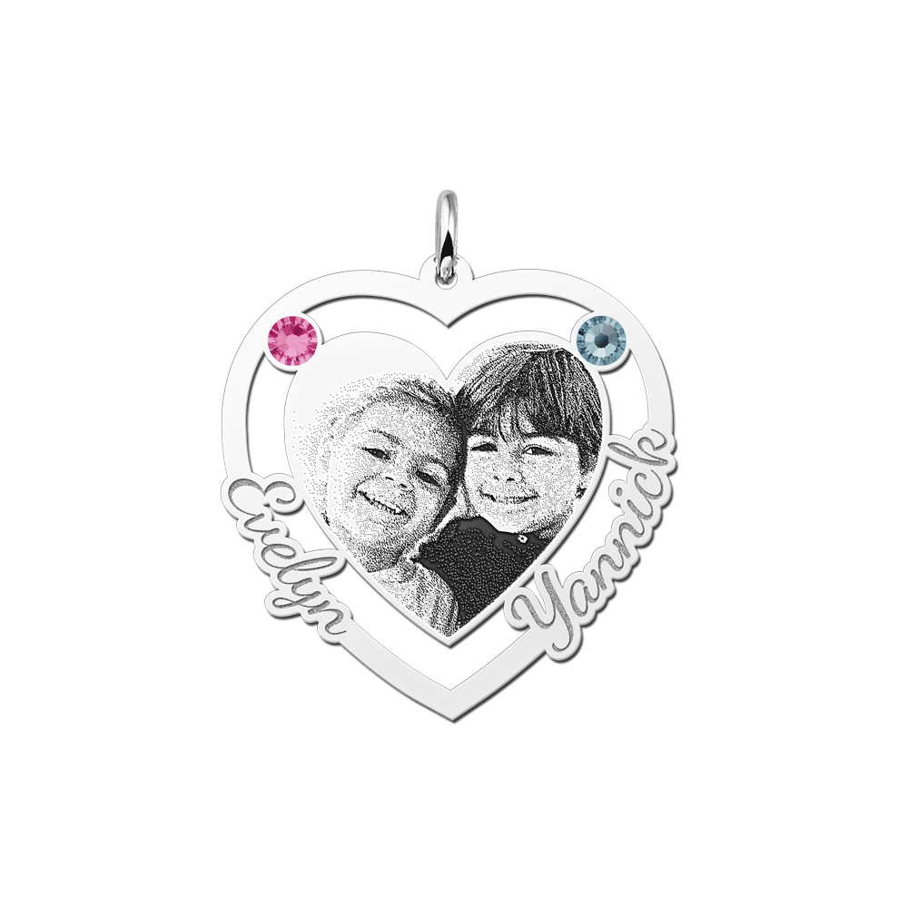 Een prachtige fotohanger met geboortestenen van zilver, vervaardigt van hoogwaardig 925 sterling zilver. Deze zilveren fotohanger in een mooie opengewerkte hartvorm heeft een formaat van ca. 30 x 31 mm en een dikte van 0,7 mm. Heeft u een mooie portretfoto waar uw kinderen samen op staan? Dan is deze fotohanger van zilver echt iets voor u. Wij maken een mooie uitsnede van de portretfoto en graveren deze met de modernste technieken in de zilveren hanger. Om de gravure extra tot zijn recht te laten komen maken wij deze donkerder. De gravure kan niet vervagen of van de fotohanger afgaan, omdat deze echt in de hanger gegraveerd wordt.