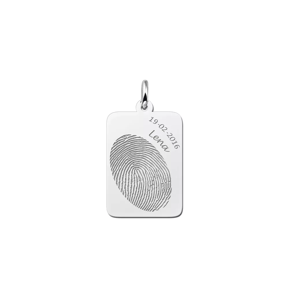 Zilveren hanger met vingerafdruk en naam en datum. Deze zilveren hanger heeft een formaat van ca. 25,5 x 15,5 mm. In deze hanger graveren wij niet alleen de door jouw ingezonden vingerafdruk, maar ook nog een naam en datum. Dit maakt de hanger tot een zeer persoonlijk sieraad. Wij hebben diverse mooie kettingen in ons assortiment, zo maak je de hanger helemaal compleet! Snelle levering en bij ons betaal je geen verzendkosten.