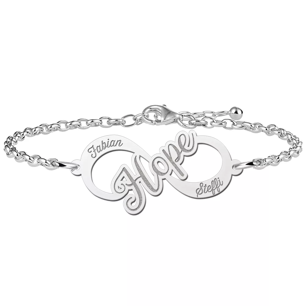 In de zilveren infinity armband hope is plek voor twee namen die erin gegraveerd kunnen worden. Zo heb je jou dierbaren altijd dichtbij je.