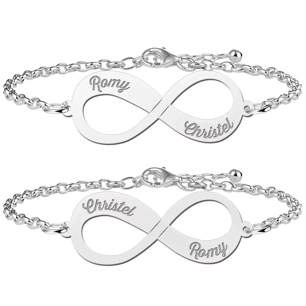 Deze set van zilveren infinity armbanden is gemaakt van 925 Sterling zilver. Iedere armband kan gepersonaliseerd worden met twee namen.