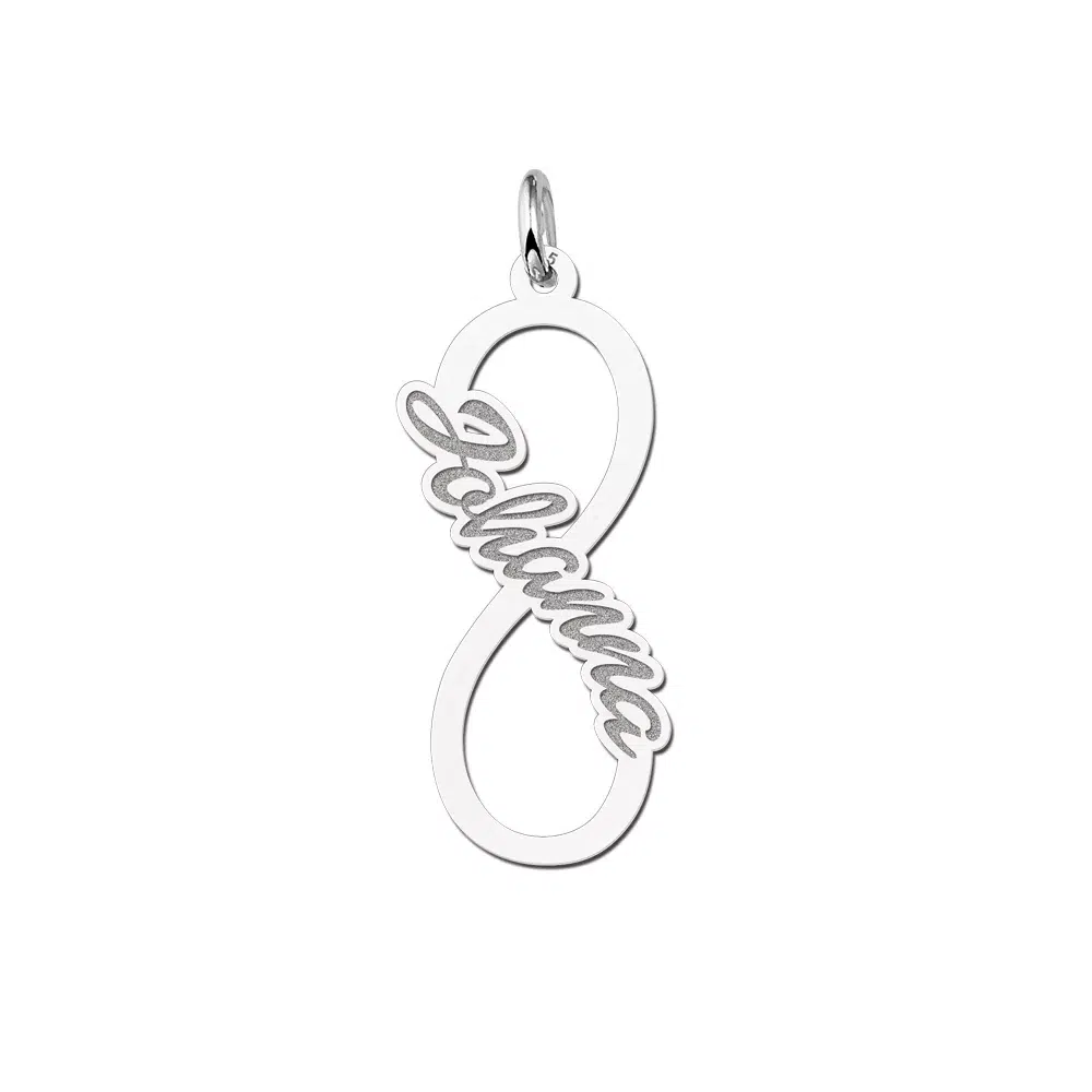 Zilveren infinity hanger kind vervaardigd van 925 sterling zilver. Deze zilveren hanger is speciaal ontworpen voor de kleinere dames onder ons. De naam wordt gemaakt in een sierlijk handschrift en het infinity teken is ca. 16 x 32 mm groot. Wie verras jij met dit infinity sieraad dat symbool staat voor oneindigheid, oneindige liefde, vriendschap en verbondenheid? Vergeet niet een van onze bijpassende kettingen te bestellen!