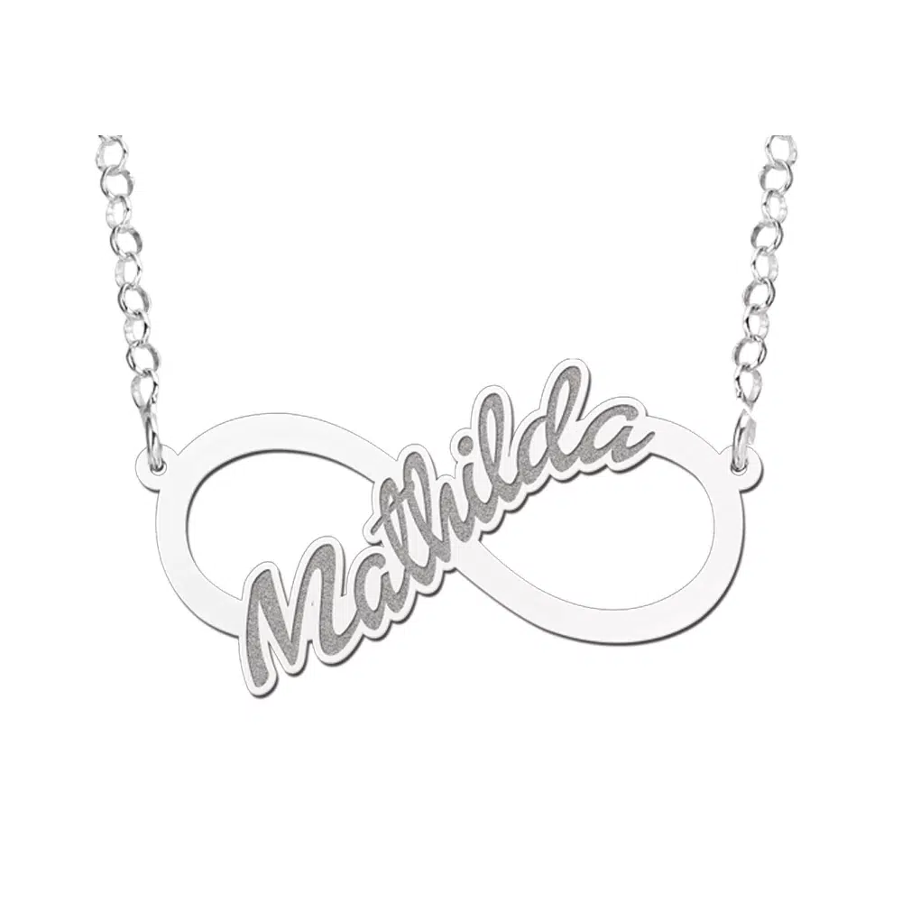 Schitterende Infinity ketting van zilver voorzien van de door jouw opgegeven naam! Deze mooie hanger heeft een formaat van ca. 40 x 18 cm en wordt vervaardigd van 925 sterling zilver. De hanger wordt geleverd inclusief een zilveren jasseron ketting met een lengte van 42 cm. Wiens naam wil jij in dit mooie zilveren oneindigheidsteken? Het infinity teken staat symbool voor oneindige liefde, vriendschap en gezondheid maar ook voor constante vernieuwing en harmonie en verbondenheid.