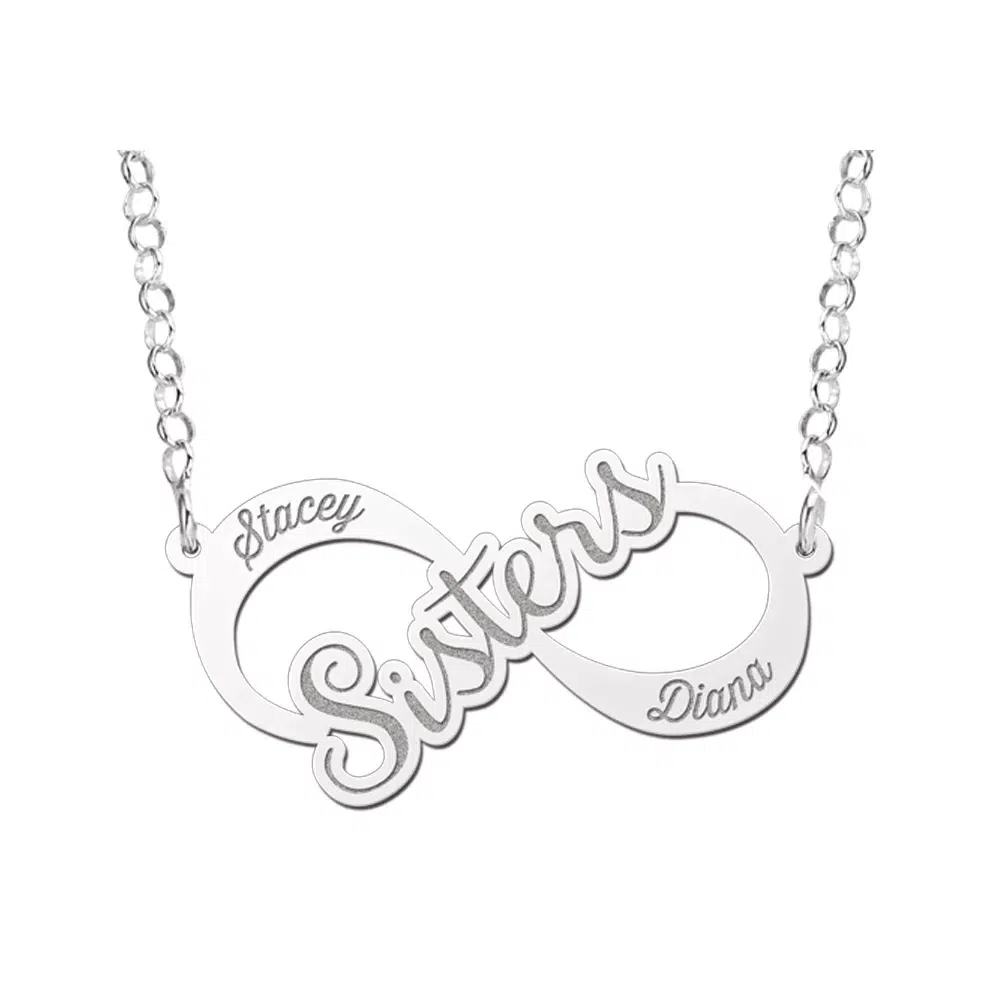 Dit is de schitterende zilveren infinity ketting sisters. Een mooie ketting die de band tussen jou en je zus benadrukt. Want dat is een bijzondere en sterke band. Iets waar jullie trots op mogen zijn! Verras je zus met deze leuke infinity ketting met jullie namen als cadeau. Een prachtig geschenk en een mooi gebaar! De lengte van de ketting is 42 cm. De infinity hanger is 38 x 20 mm groot.