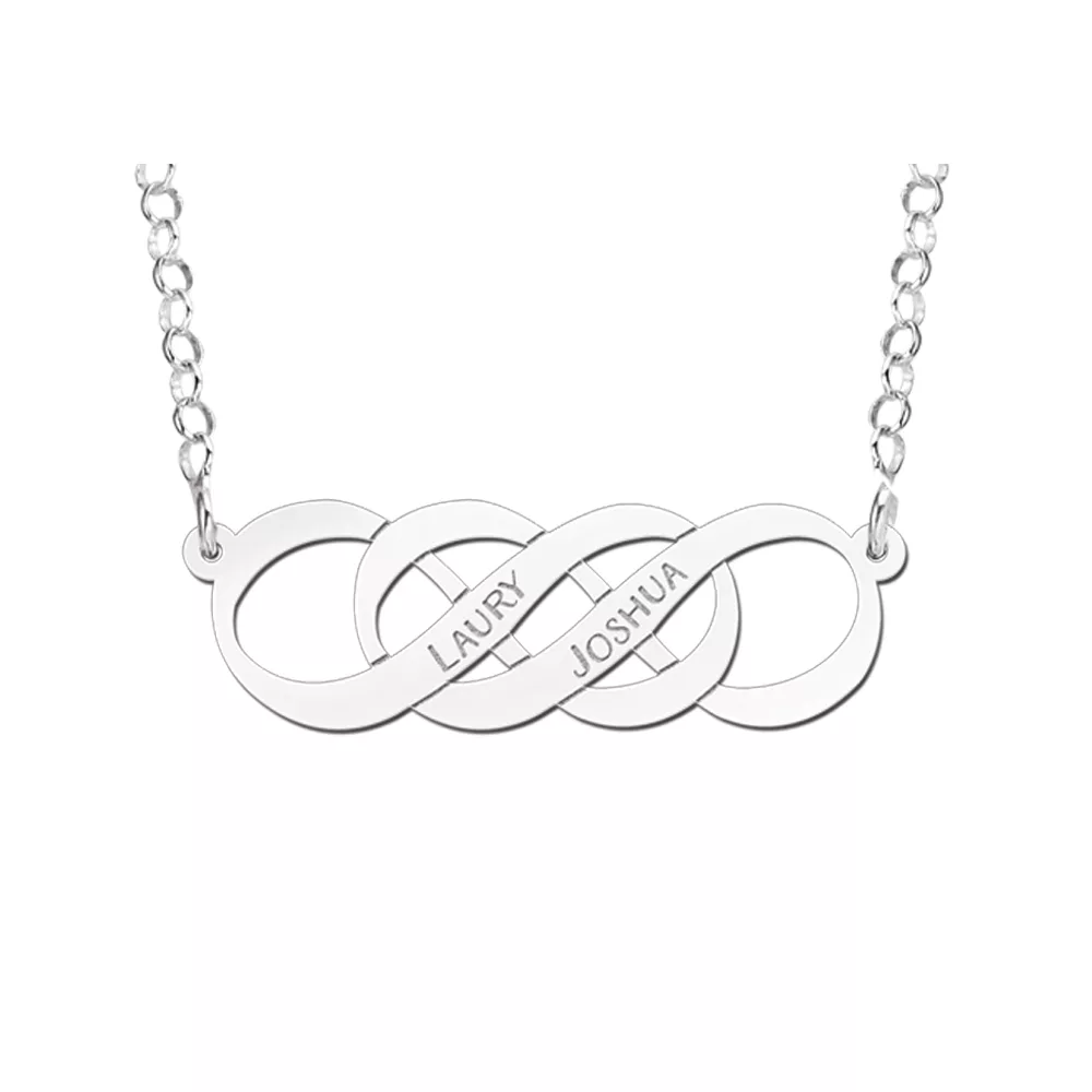 Prachtige zilveren ketting met een dubbel infinity symbool en persoonlijke gravure. De gedachte achter het dubbel infinity symbool is dat het eindeloze tijd en ruimte biedt om tot perfectie te komen. Ook geeft het evenwicht aan je liefdesleven en het leven in het algemeen. Met wie ben jij in evenwicht? Deze zilveren infinity ketting biedt plaats voor jullie beider namen! Een zeer bijzondere zilveren infinity ketting om de namen van jou en je partner op te dragen, maar ook de namen van je kinderen. Zo word je tijdens het dragen altijd liefdevol herinnerd aan de wensen die je voor je kinderen hebt, een lang en gelukkig leven waarin ze de tijd en ruimte krijgen om hun persoonlijke wensen te vervullen! Het dubbel infinity symbool is vervaardigd van hoogwaardig 925 sterling zilver en heeft een formaat van ca. 50 x 15 mm en een dikte van 0,7 mm. De zilveren infinity ketting wordt compleet geleverd inclusief een 42 cm lang jasseron collier.