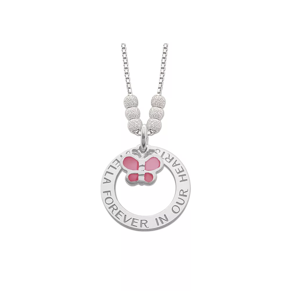 Zilveren mama ketting met vlinder ingelegd met roze parelmoer, vervaardigd van hoogwaardig 925 sterling zilver.De zilveren hanger heeft een diameter van ca. 17 mm en een dikte van 0,7 mm. In de hanger zetten we een korte tekst of naam en datum naar keuze. Door de toevoeging van de roze vlinder is deze mama ketting ook zeer geschikt als elegant en subtiel gedenksieraad aan een verloren kindje. De zilveren mama ketting wordt compleet geleverd met een zillveren ketting met venetiaanse schakel en 6 gediamanteerde zilveren kralen. De zilveren ketting heeft een totale lengte van 42 cm maar is ook verstelbaar op 38 cm.