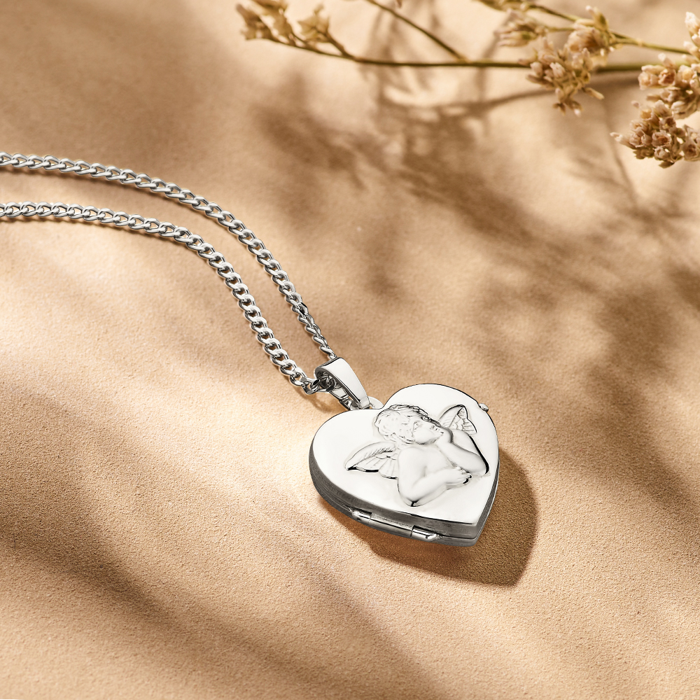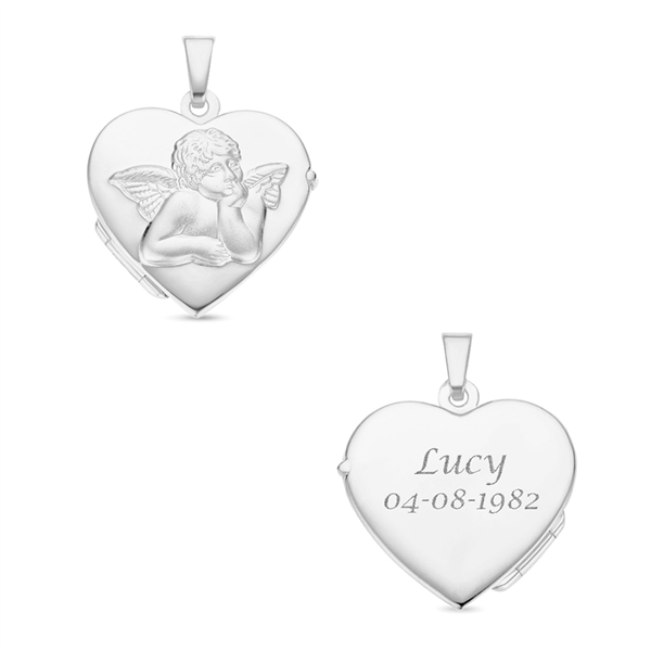 Een mooi glanzend harten medaillon met beschermengel. Graveer het medaillon en maak er een uniek aandenken van. Voeg een foto toe aan de binnenkant en draag jouw dierbare altijd bij je. Op de hanger kunnen namen en data worden gegraveerd. De breedte is 18,5 mm en de hoogte 17 mm. Ernaast kun je ook een bijpassende ketting voor de hanger kiezen. We hebben kettinglengtes van 38 – 42cm en 45 – 50cm. Hier kan je kiezen uit verschillende soorten kettingen. Wil je de ketting cadeau geven? Dat komt mooi uit! Je ontvangt deze namelijk in een mooi sieradendoosje.