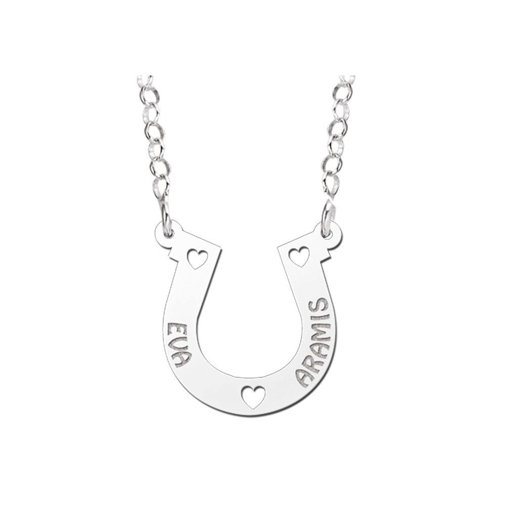 Zilveren naamketting hoefijzer. In het hoefijzer staan 3 hartjes en is er plaats voor 2 namen. Jouw naam, naam van je paard of pony, naam van je BFF of van de manege. Jouw keuze! De namen worden gegraveerd in de hanger. Het hoefijzer is ca. 18 x 20 mm groot en de jasseron ketting is 42 cm. lang. Snelle en gratis levering!