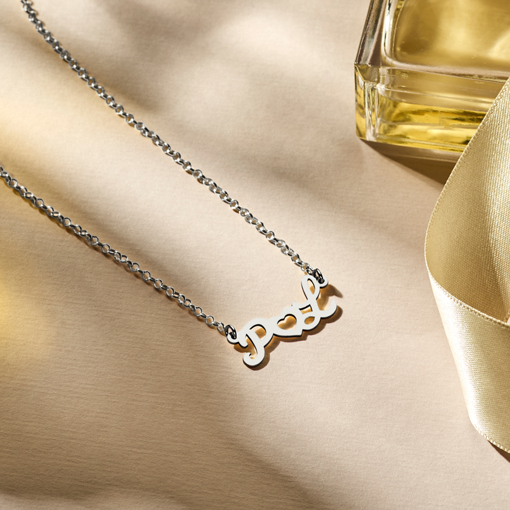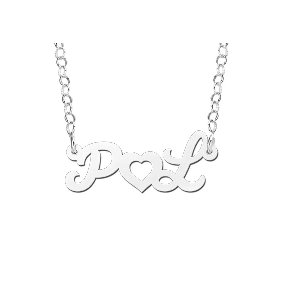 Zilveren naamketting in schuine Romantisch zilveren naamcollier van initialen in hoofdletters met in het midden een lief hartje. Het ultieme collier om te laten zien aan wie jouw hart behoort! De 2 letters met hartje is compleet ca. 25 x 10 mm groot.