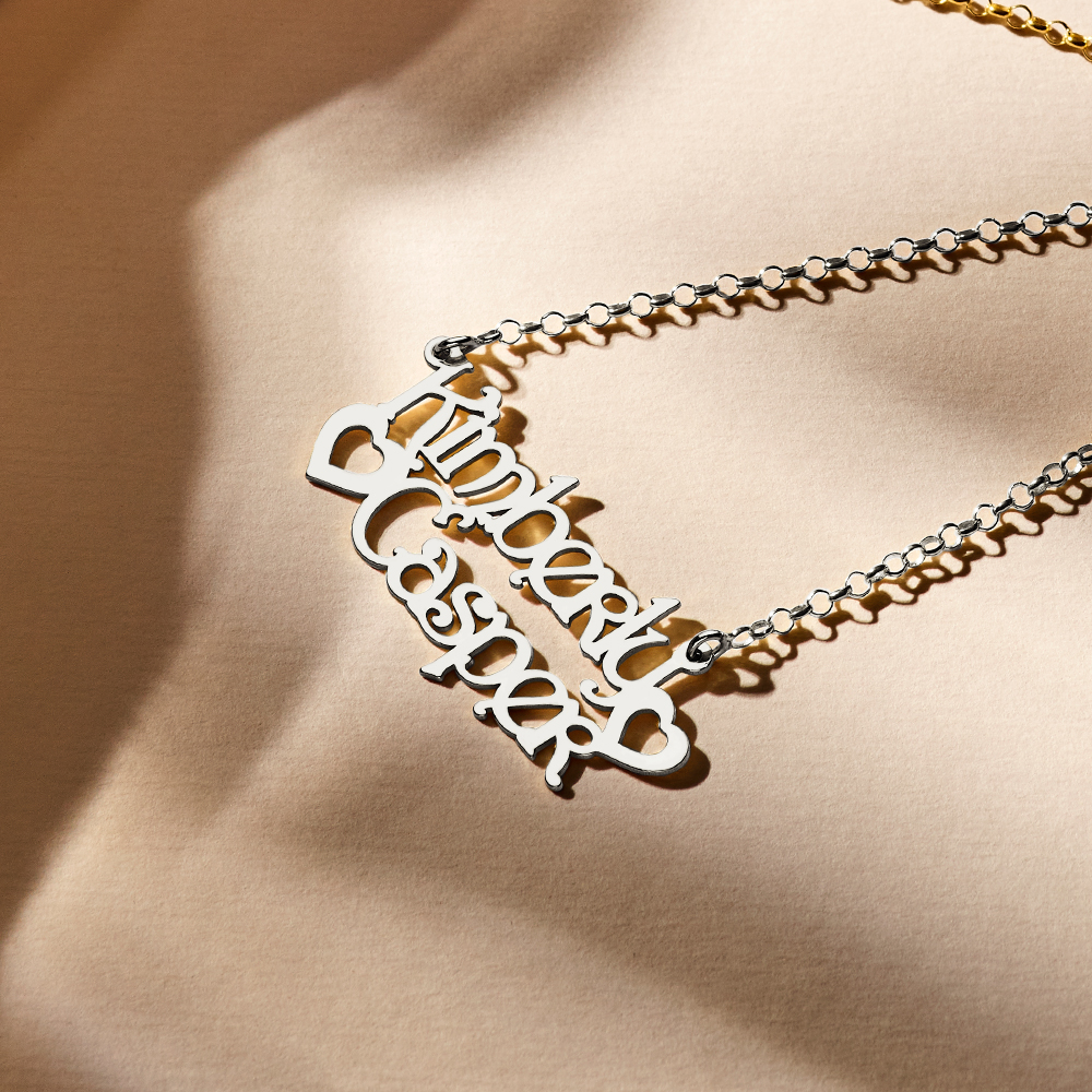 Zilveren naamketting voor 2 namen in artdeco letters. Bijzonder romantisch! Een gemiddelde maat van dit model is ca. 20mm hoog x 45mm breed. Maat is ter indicatie! Het formaat en plaatsing van de hartjes is afhankelijk van de bestelde namen.