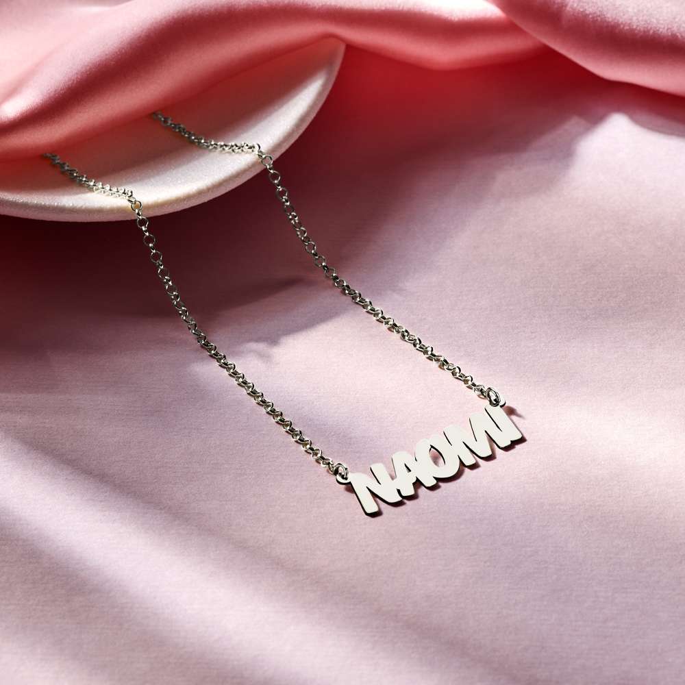Zilveren naamketting in opvallend grote letters. Alle letters zijn hoofdletters! Super opvallende naamketting. In dit model is het formaat van een gemiddelde naam van 5 letters ca. 11 mm hoog x 38mm breed. Deze maat is slechts ter indicatie!