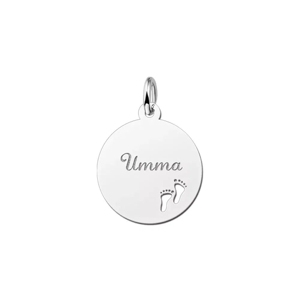 Een plaatje van zilver met twee voetjes en de naam van je kindje erin.