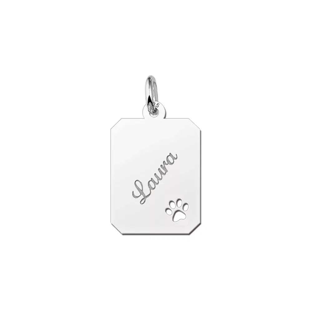 Geef de gewenste naam door en wij graveren voor jou een mooie zilveren naamsieraad rechthoek met pootje.