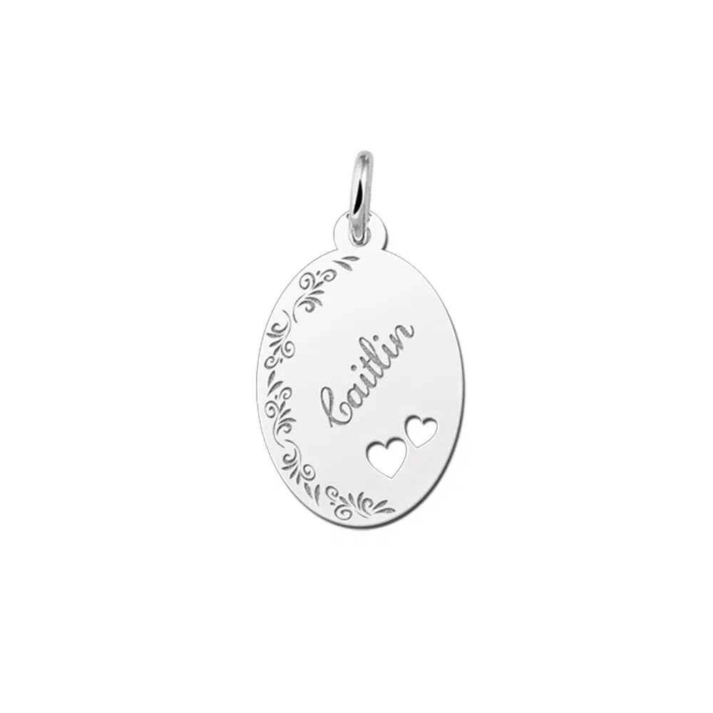 De zilveren hanger voor je naam gravure heeft 2 beeldige harten. en word voorzien met de naam van jouw keuze, die zullen wij dan in sierlijke letters er voor je in graveren.Vergeet niet een bijpassende zilveren ketting, in de juiste lengte mee te bestellen!