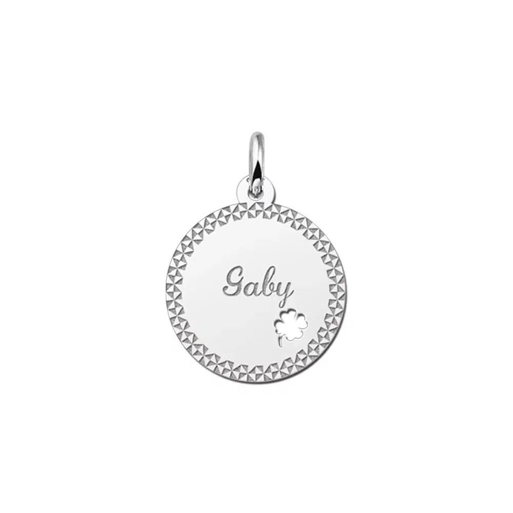 Dit is een schitterend plaatje met je naam en een prachtig klavertje vier erin met een elegante sierrand. Wat een in het oog springend cadeau is dit om te geven. Of natuurlijk als cadeau voor jezelf om vervolgens de naam van je grote liefde erin te laten graveren! Dat is wel een heel mooi gebaar. De naam van jouw geliefde gegraveerd in dit beeldige plaatje met je naam en een geluks klavertje vier. Wat romantisch! Geef de naam van jouw keuze door en wij zullen het er met veel liefde in graveren. De doorsnede van het plaatje met je naam is 17 x 17 mm.