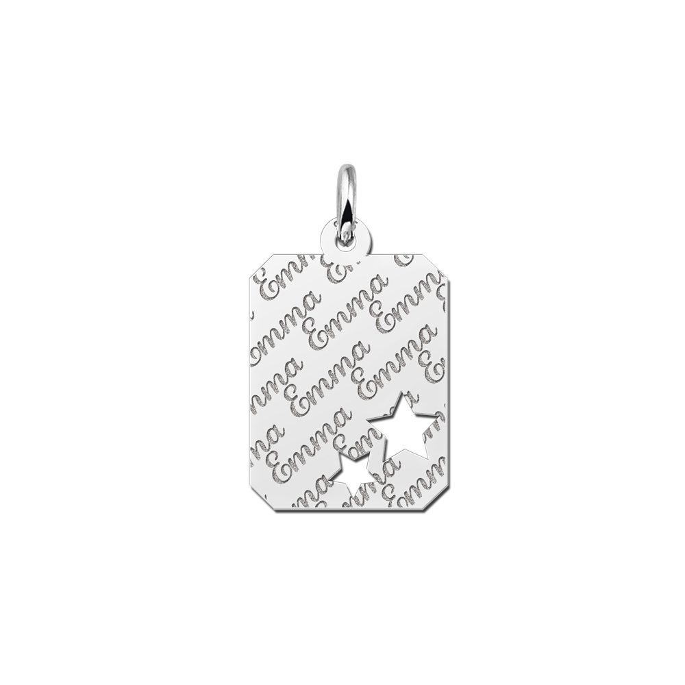 Het zilveren graveerplaatje 8-kant is ca. 14 x 18 mm groot, met 2 sterren en wordt voorzien van de naam naar keuze. De naam wordt herhaaldelijk in sierlijke letters gegraveerd. Dit geeft een moderne twist aan de graveerplaat.Vergeet niet een bijpassende ketting mee te bestellen. Snelle en gratis levering!