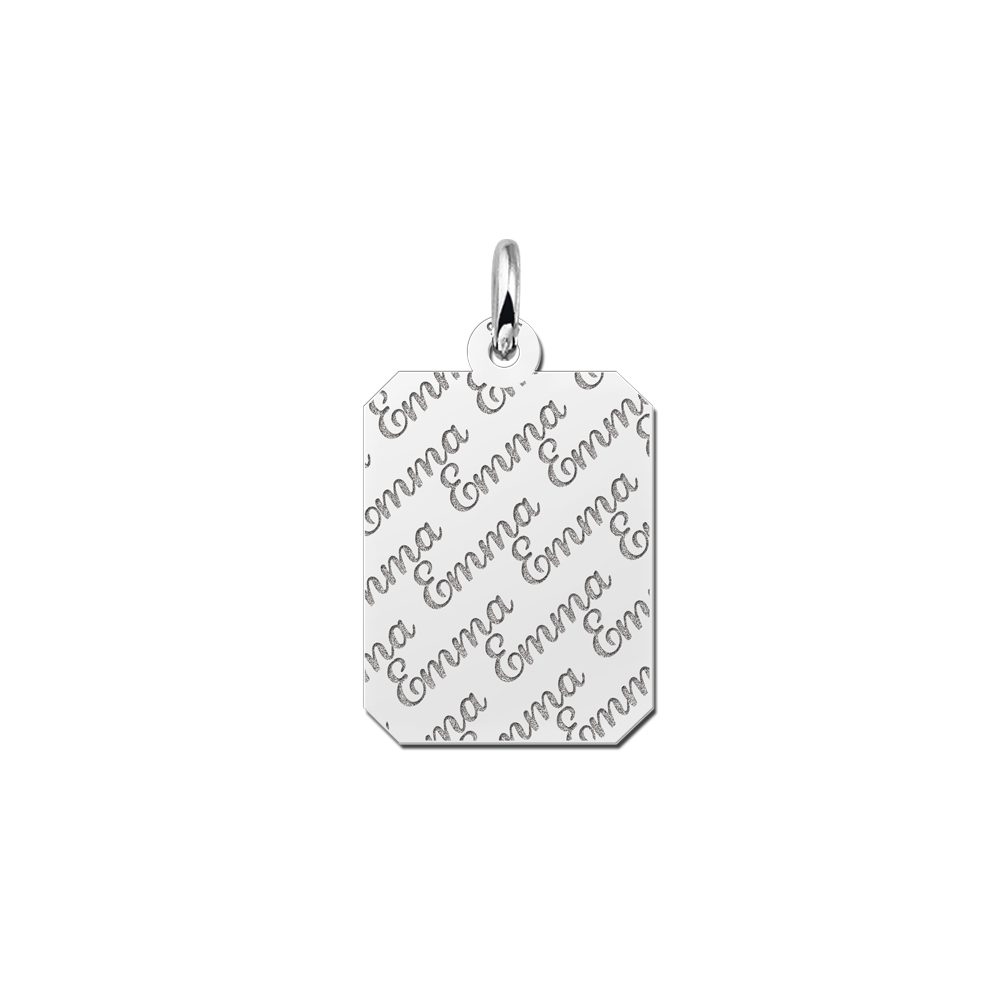 Het zilveren graveerplaatje 8-kant is ca. 14 x 18 mm groot en wordt voorzien van de naam naar keuze. De naam wordt herhaaldelijk in sierlijke letters gegraveerd. Dit geeft een moderne twist aan de graveerplaat.Vergeet niet een bijpassende ketting mee te bestellen. Snelle en gratis levering!