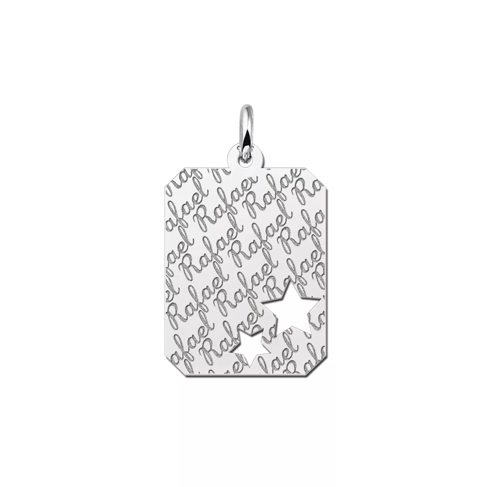 Het zilveren graveerplaatje 8-kant is ca. 16 x 20 mm groot, met 2 sterren en wordt voorzien van de naam naar keuze. De naam wordt herhaaldelijk in sierlijke letters gegraveerd. Dit geeft een moderne twist aan de graveerplaat.Vergeet niet een bijpassende ketting mee te bestellen. Snelle en gratis levering!