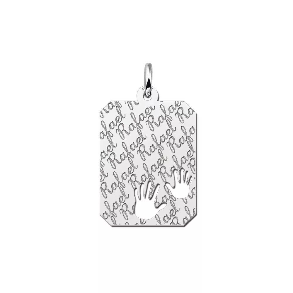 Het zilveren graveerplaatje 8-kant is ca. 16 x 20 mm groot, met baby handjes en wordt voorzien van de naam naar keuze. De naam wordt herhaaldelijk in sierlijke letters gegraveerd. Dit geeft een moderne twist aan de graveerplaat.Vergeet niet een bijpassende ketting mee te bestellen. Snelle en gratis levering!
