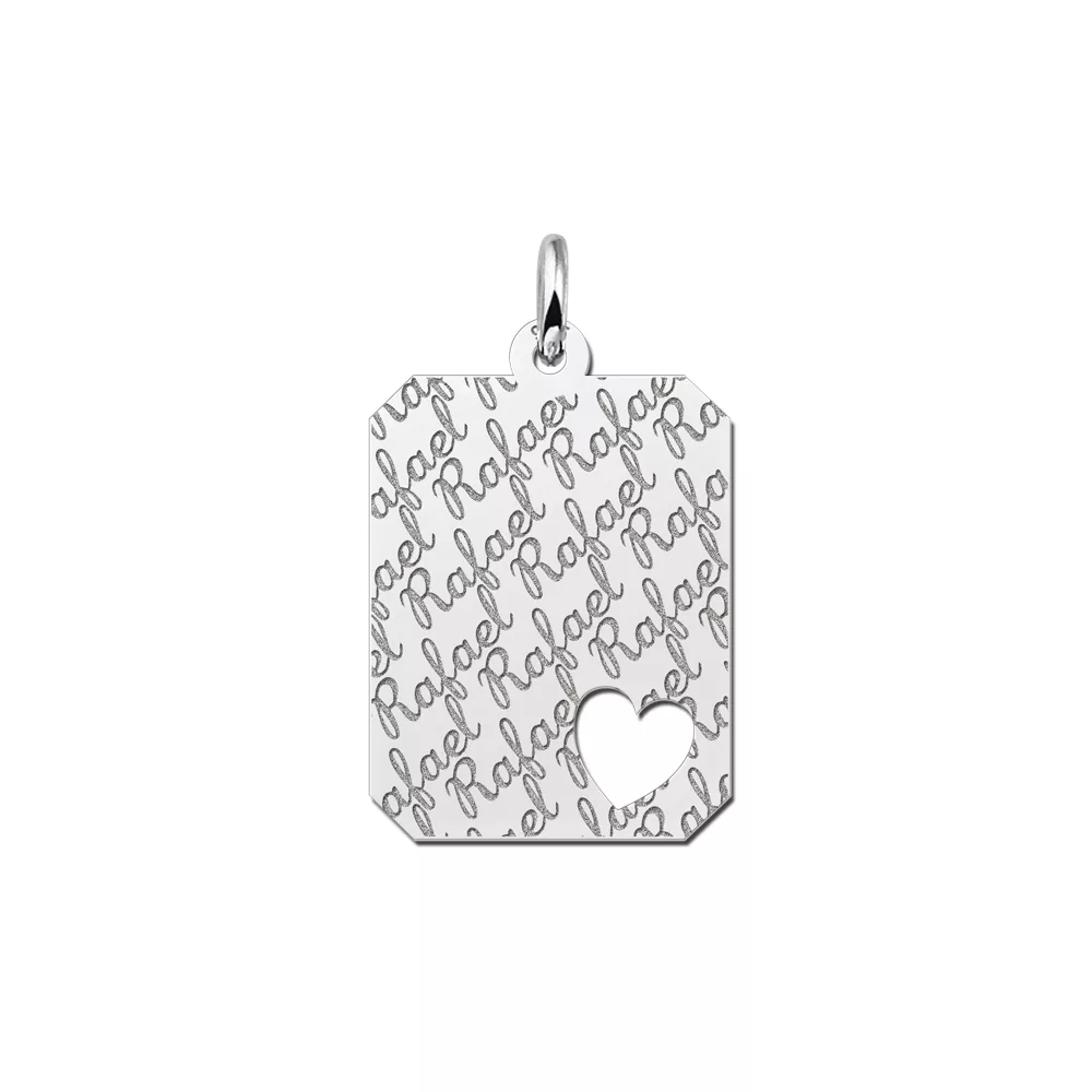 Het zilveren graveerplaatje 8-kant is ca. 16 x 20 mm groot, met een hartje en wordt voorzien van de naam naar keuze. De naam wordt herhaaldelijk in sierlijke letters gegraveerd. Dit geeft een moderne twist aan de graveerplaat.Vergeet niet een bijpassende ketting mee te bestellen. Snelle en gratis levering!