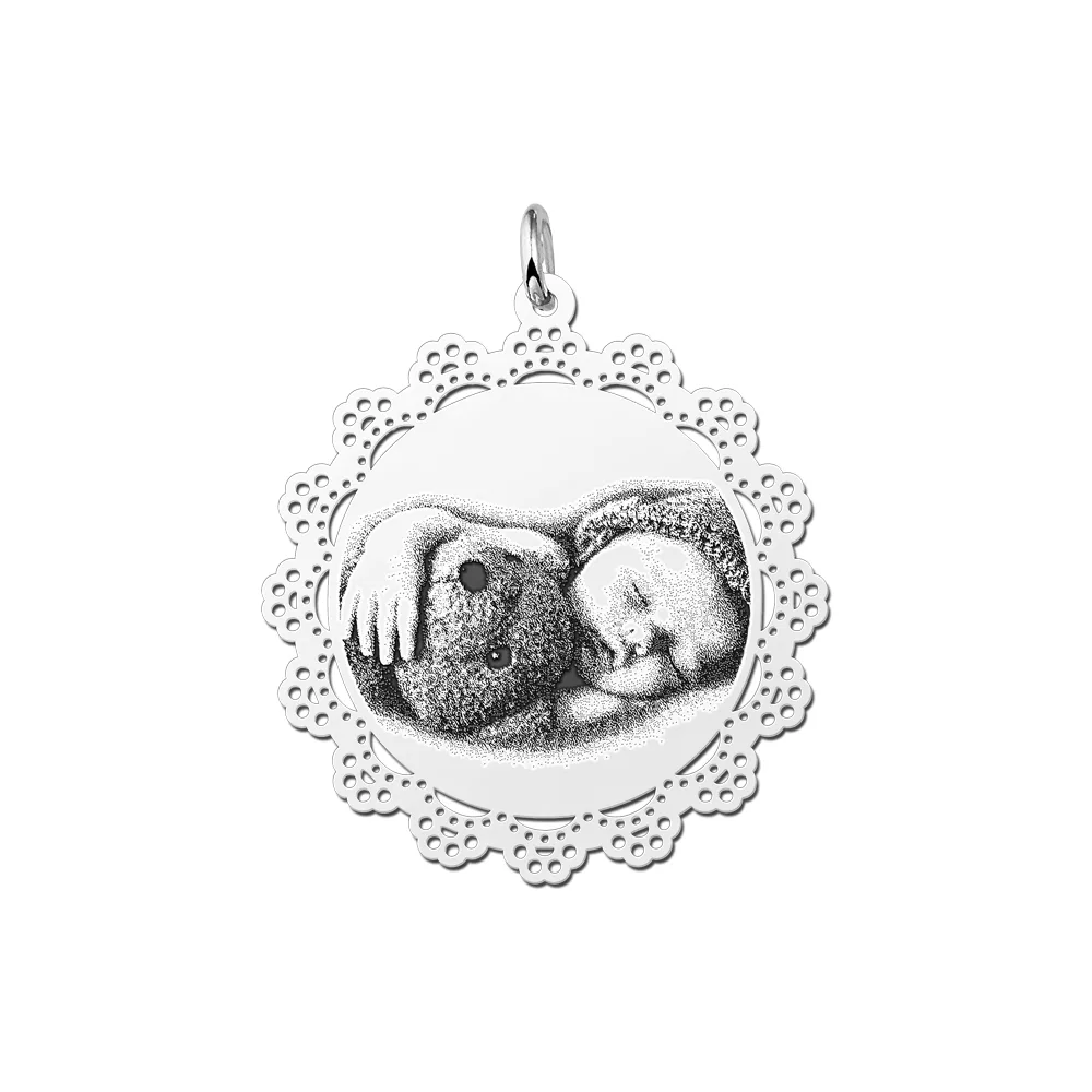 Van 925 Sterling zilver vervaardigde ronde fotohanger met bewerkte rand. Deze zilveren fotohanger heeft een diameter van ca. 33 mm en een dikte van 0,7 mm. Bij gebruiken we de nieuwste technieken om jouw lievelingsfoto tot een mooi gedetailleerd sieraad te maken. Na het maken van een mooie uitsnede graveren wij de foto in de zilveren hanger. De foto gravure kan niet van de hanger af gaan of vervagen. Met een speciale techniek maken we de gravure van de foto wat donkerder. Zo is deze altijd goed zichtbaar!