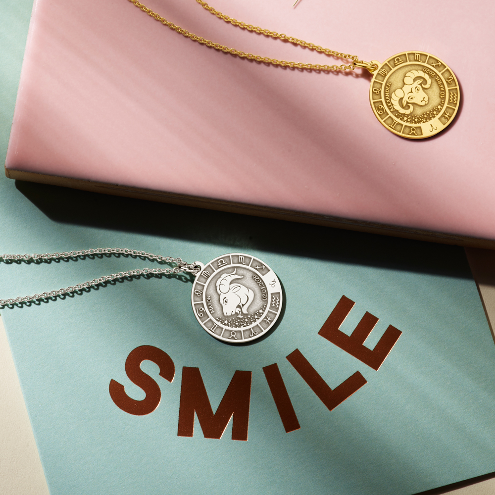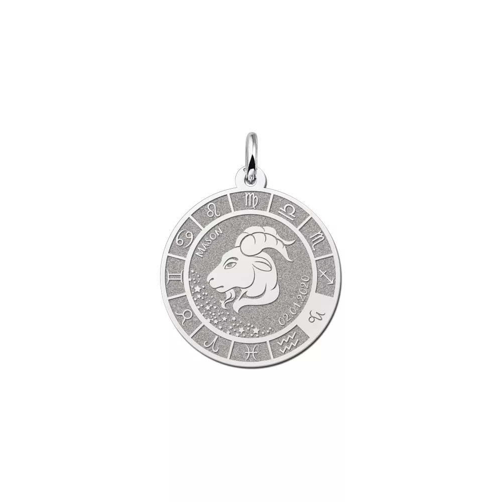 Op deze sieraad is het sterrenbeeld Steenbok gegraveerd. De Steenbok geborene is een mens met een praktische en zakelijke wil. Het sieraad is 21.7 mm breed en 21.7 mm hoog. De dikte van de hanger is 0,7 mm.