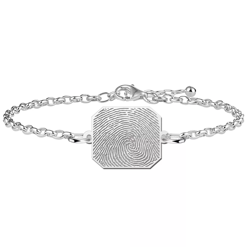 Prachtige armband met vingerafdruk met rechthoekige hanger. De hanger heeft een grootte van 16.5 mm x 15 mm en kan gegraveerd worden met elke vingerafdruk die je wenst. Zo is deze vingerafdruk armband een prachtig sieraad voor bijvoorbeeld de vingerafdruk van je overleden dierbare, vriend/vriendin of kindje. Kortom: een prachtig gedenksieraad, maar ook een mooie armband om je relatie mee te vieren.