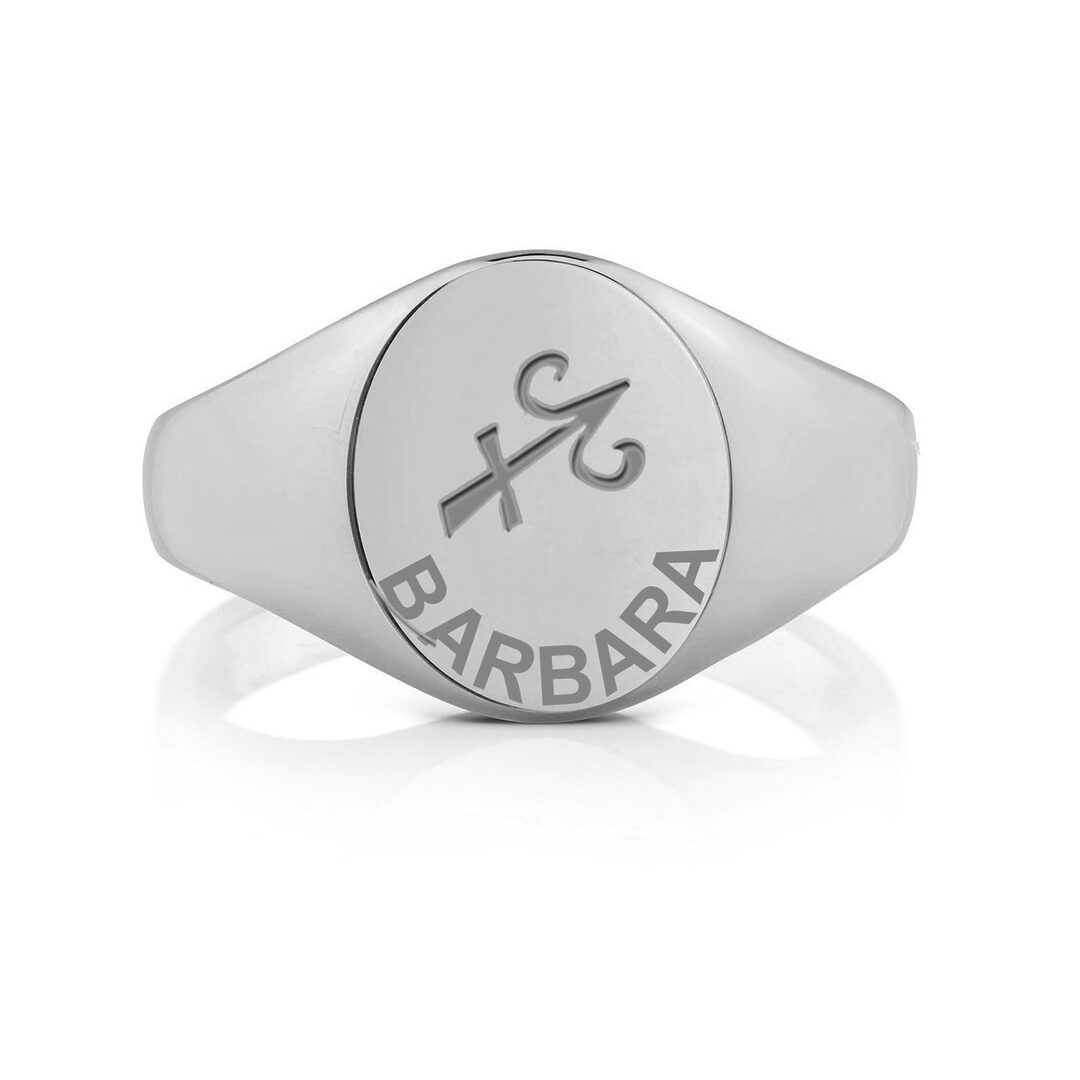 Ben je geboren tussen 22 november en 21 december en dus een Boogschutter? Bekijk dan eens deze mooie zegelring met het sterrenbeeld-symbool Boogschutter. De zegelring is gemaakt van 925 Sterling zilver en kan gepersonaliseerd worden met een naam.