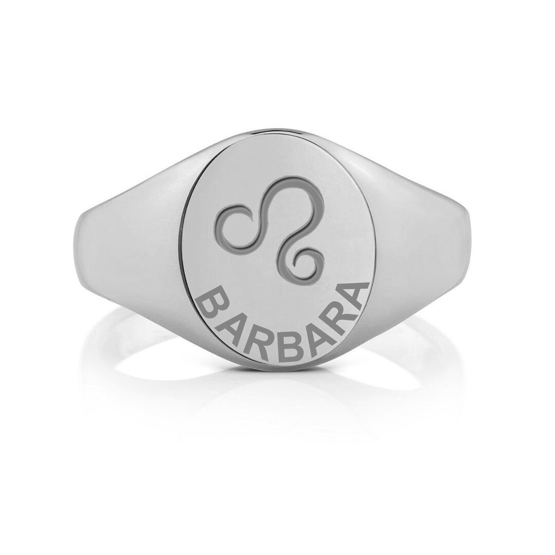 Deze zilveren zegelring met het sterrenbeeld-symbool Leeuw is een echte eye-catcher en perfect geschikt voor een hij of zij die Leeuw is. De zegelring is gemaakt van 925 Sterling zilver en kan gepersonaliseerd worden met een naam.