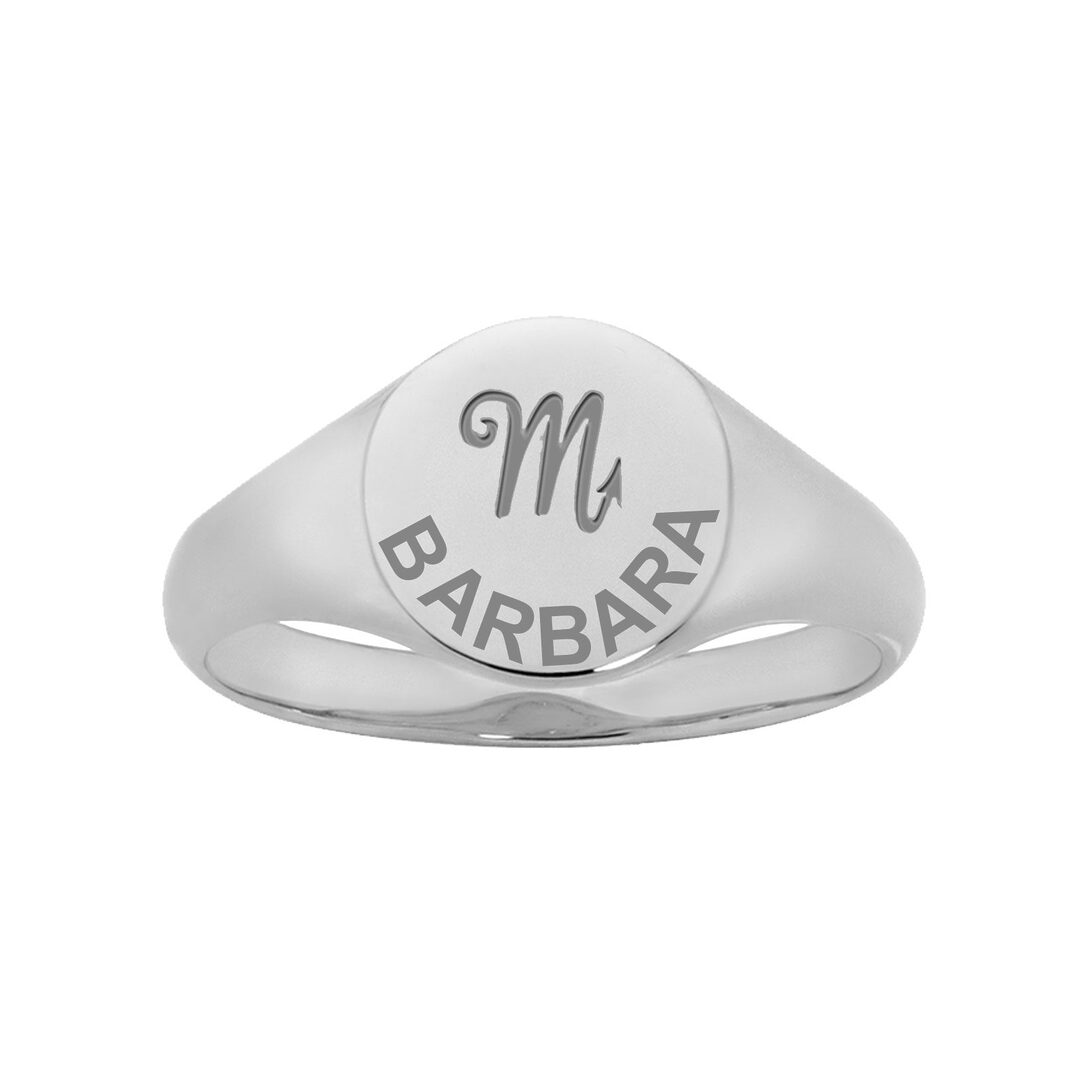 Deze zilveren zegelring heeft een plaatje waar het sterrenbeeld-symbool Schorpioen uitgesneden is. De zegelring is gemaakt van 925 Sterling zilver en kan gepersonaliseerd worden met een naam.